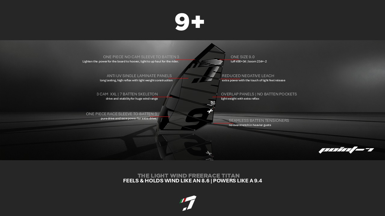 The 9+ Light Wind Titan is our new freerace engine for riders who want early planing, real fin acceleration, and powerful stable drive when the wind is not delivering. Built with the latest Point-7 construction technology, it stays light in your hands and easy to handle. Even when uphauling. Even when the wind is under 12 knots. And when it is time to pump onto the plane, it delivers exactly what you need.