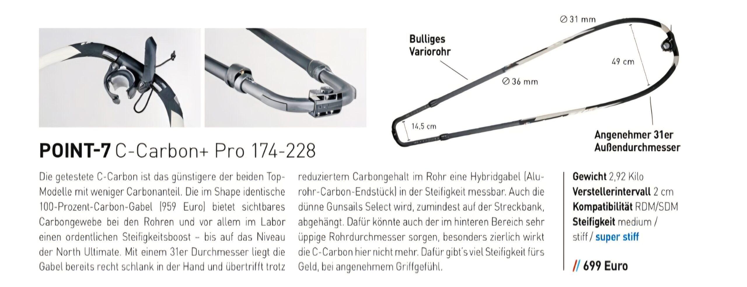 The tested C-Carbon is the more affordable of the two top models, with a lower carbon content. The 100% carbon boom (959 euros), identical in shape, features visible carbon weave on the tubes and, above all in lab tests, provides a significant boost in stiffness—up to the level of the North Ultimate.
